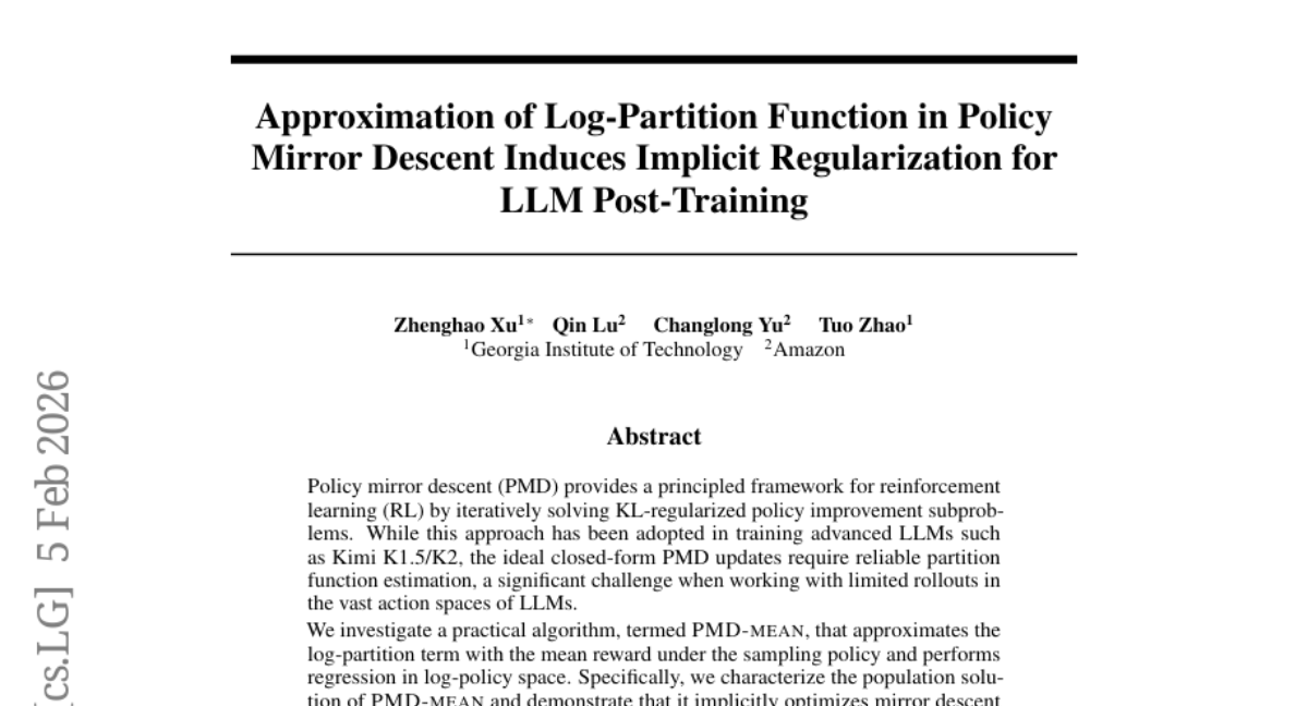 Approximation of Log-Partition Function in Policy Mirror Descent Induces Implicit Regularization for LLM Post-Training