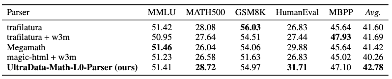 To fairly compare different parsing strategies, we conducted experiments on a data subset sampled from the 2023-2024 distribution. We re-parsed the raw HTML from this source using different parsers. This comparison demonstrates the effectiveness of our L0 Parser against other parsers.