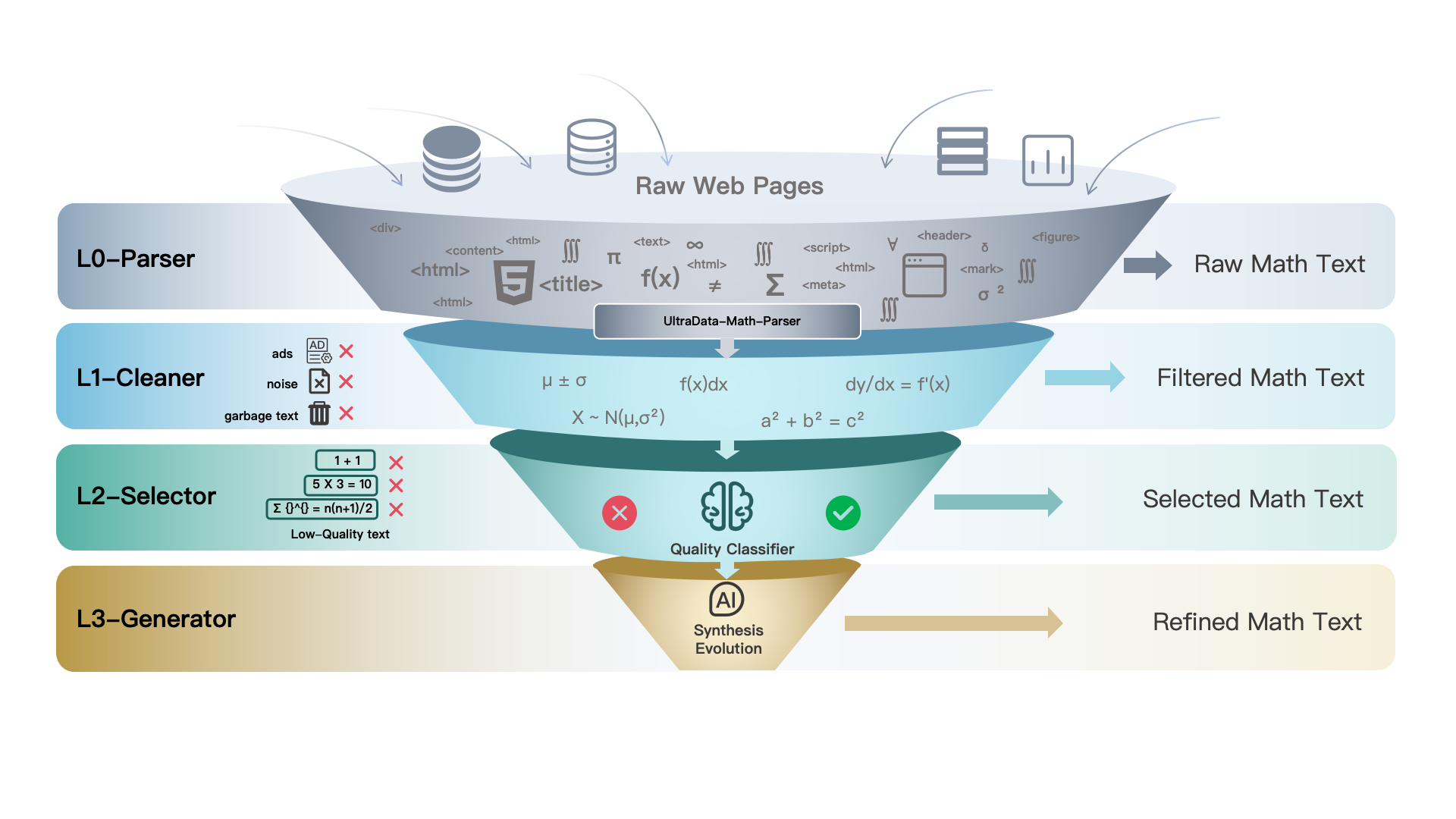 To address these issues, we propose UltraData-Math—a large-scale high-quality pre-training dataset for mathematical reasoning tasks. This dataset is developed based on the UltraData L0-L4 Tiered Data Management Framework, containing four progressive levels: