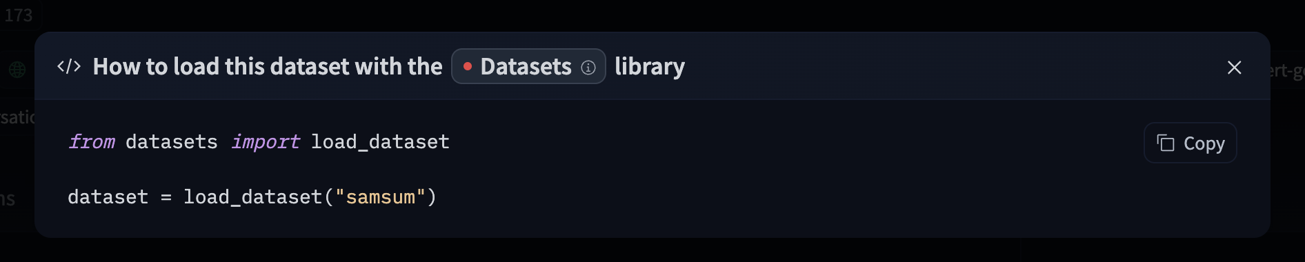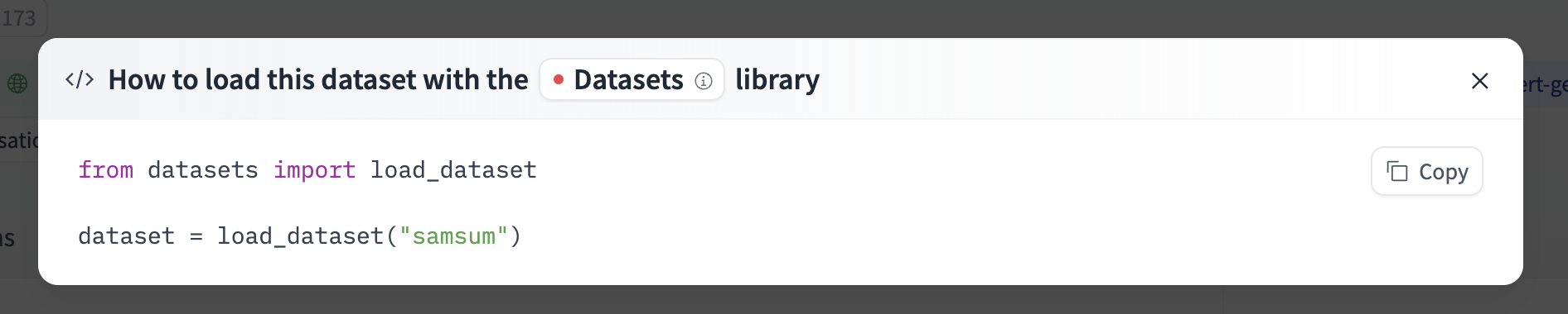 If a dataset on the Hub is compatible with a supported library that allows streaming from Hugging Face, streaming the dataset can be done in just a few lines. For information on accessing the dataset, you can click on the “Use this dataset” button on the dataset page to see how to do so. For example, knkarthick/samsum shows how to do so with datasets below.