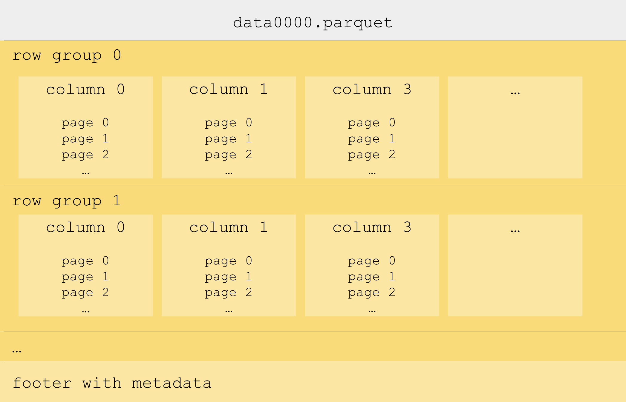 Inside row groups are individual columns, which are divied into pages. Pages are the compressed block of around 1MB which contain the actual data.