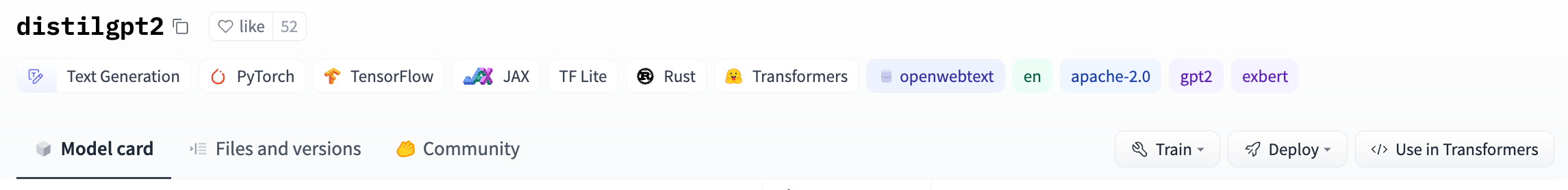 If a model on the Hub is tied to a supported library, loading the model can be done in just a few lines. For information on accessing the model, you can click on the “Use in Library” button on the model page to see how to do so. For example, distilbert/distilgpt2 shows how to do so with 🤗 Transformers below.