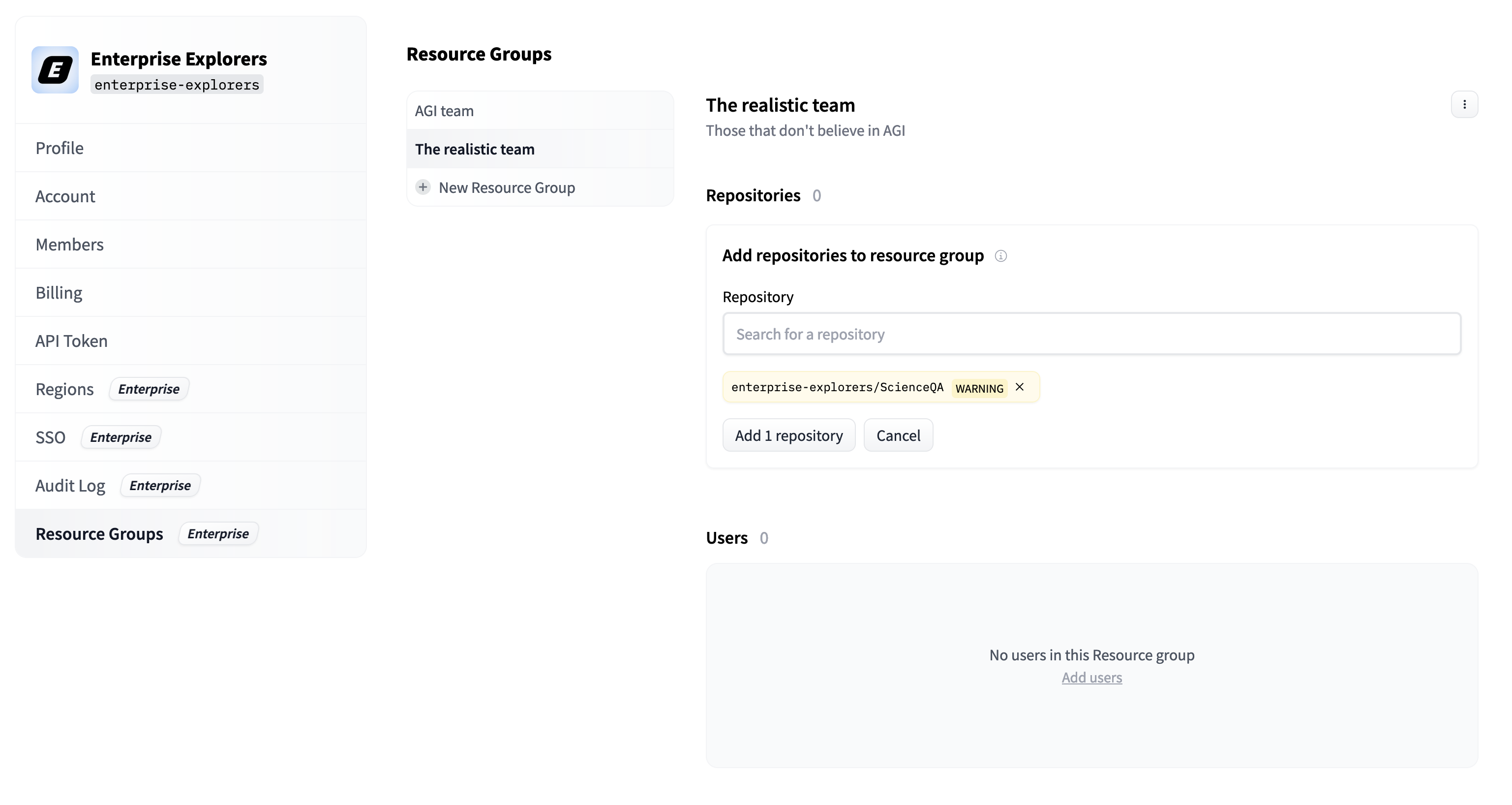 After creating a resource group and giving it a meaningful name, you can start adding repositories and users to it.