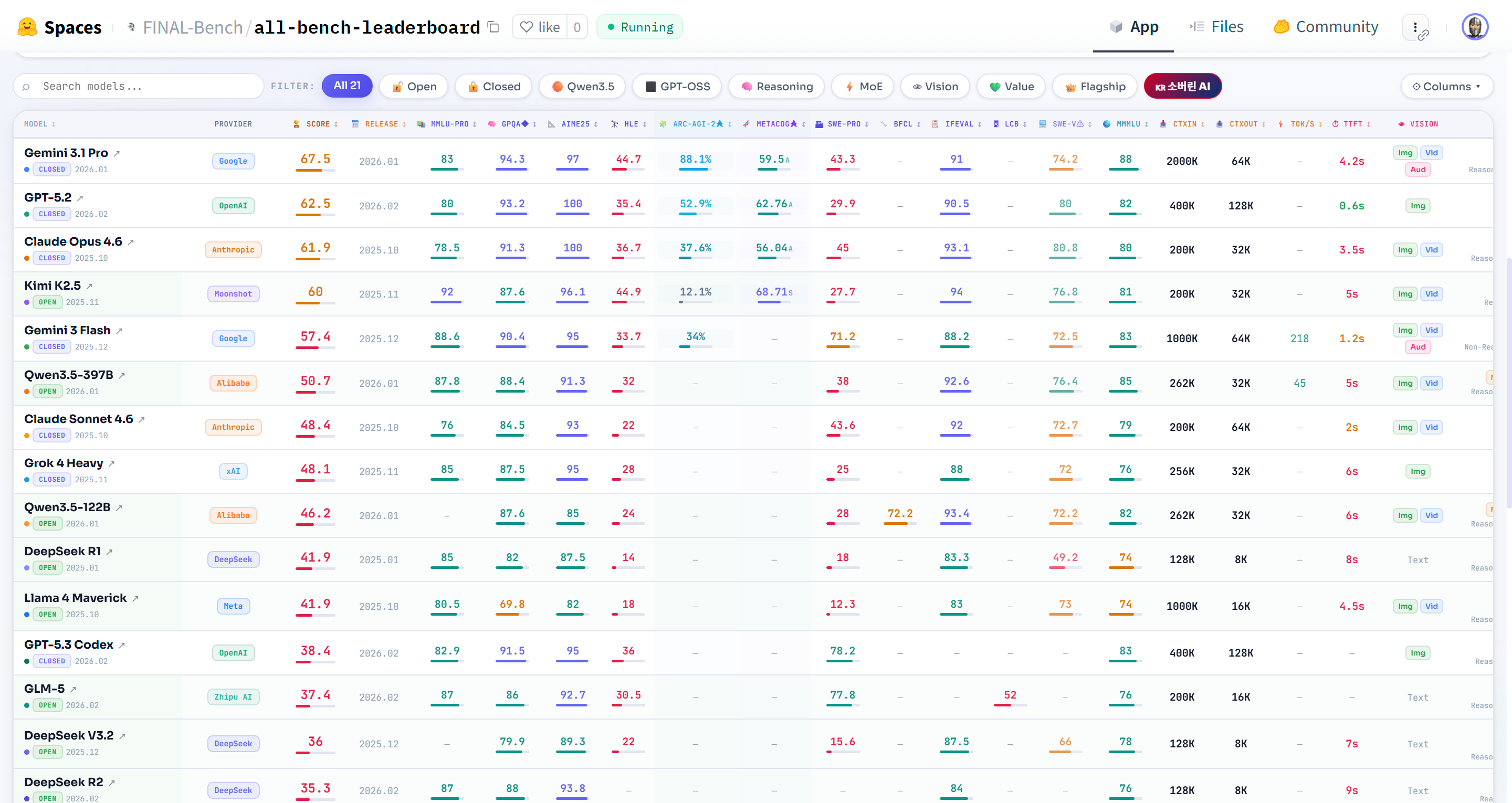 If you've ever tried to compare GPT-5.2 and Claude Opus 4.6 side by side, you've probably hit the same wall: the official Hugging Face leaderboard only tracks open-source models, so the most widely used AI systems simply aren't there. ALL Bench fixes that by bringing closed-source models, open-weight models, and — uniquely — all four teams under South Korea's national sovereign AI program into a single leaderboard. Thirty-one frontier models, one consistent scoring scale.